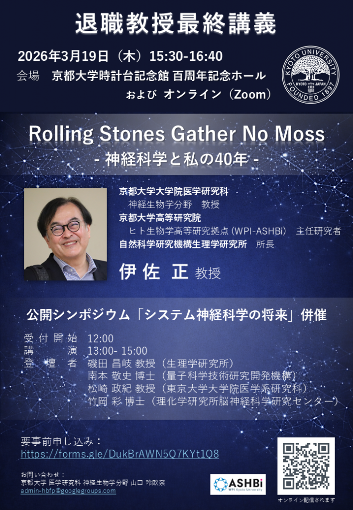 - 15:30ー16:40 伊佐先生最終講義「Rolling Stones Gather No Moss – 神経科学と私の40年 -」